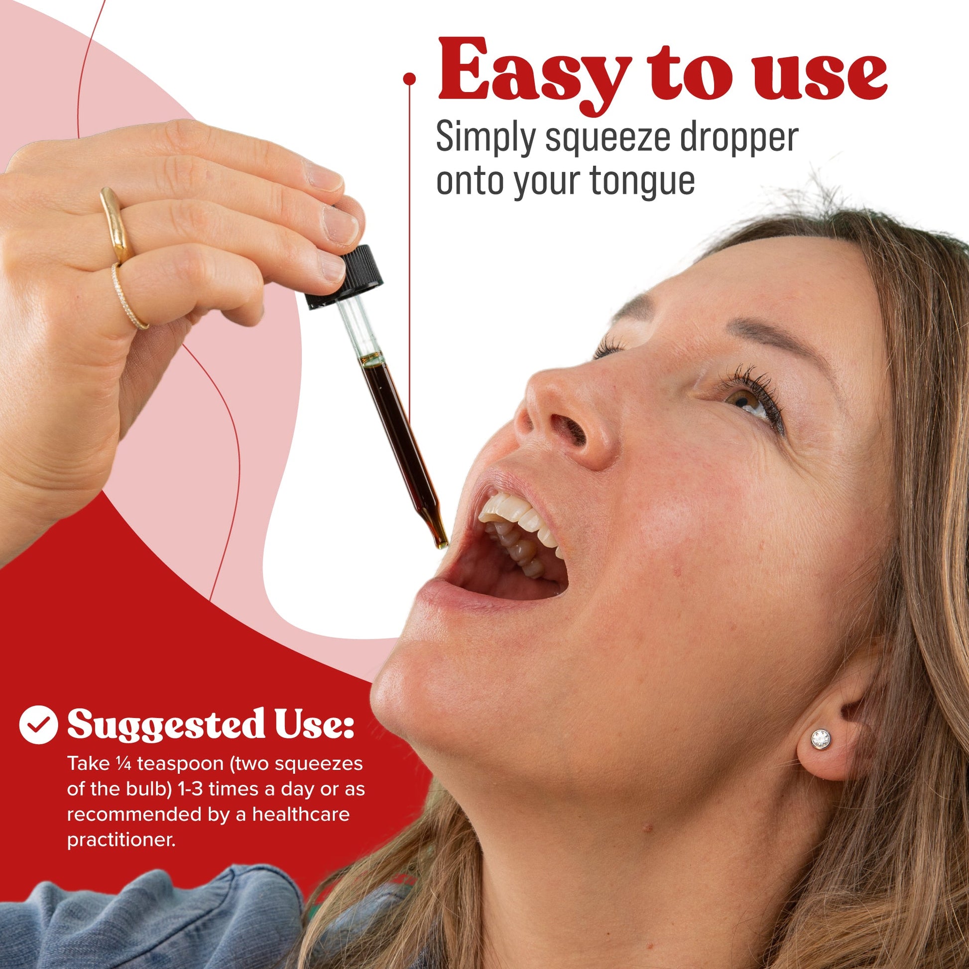 Squeeze 1/4tsp (1-2 full droppers) into a glass of water or directly into your mouth, and swallow. "